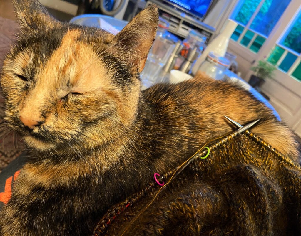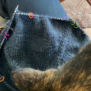 De tweede, oeps daar heb ik alleen een start foto van🙄 (die moet ik toch maar eens maken) heb ik gemaakt van Madelinetosh Tosh sport in Thunderstorm samen gebreid met een draadje Rowan Kid Silk Haze in de kleur 632 huricane. Deze heb ik op naalden 5 gebreid, maar wel de XL maat. Dit is dus een echt oversized vest geworden, ik heb geen zakken gemaakt en ik heb de mouwen aangepast door er een strak boord van 25 cm aan te maken waardoor je pofmouwen krijgt (ok foto is echt nodig).😅 Je kunt hieronder in iedergeval de kleur zien ( en een deel van onze kat Ouzi).